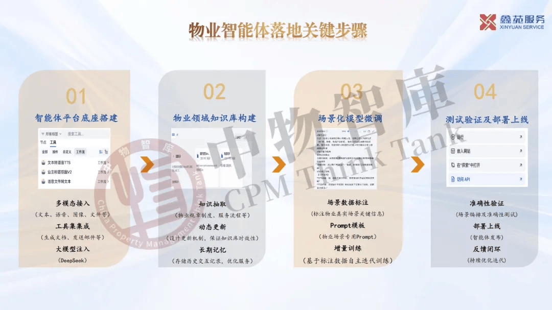 正在国度鼎力成长数字经济和人工智能的计谋布景下,鑫苑科技办事集团积极摸索AI+物业的立异模式,通过建立智能化平台和打制专业智能体,全面提拔物业办事质量和运营效率。目前,已正在多个营业场景实现AI深度使用,取得显著成效。AI客服系统实现了7×24小时不间断办事。系统基于企业学问库建立,具备持久回忆能力,可以或许完整记实每次交互内容,确保办事持续性。正在运营模式上,采用人工+AI的协同机制:工做时间由人工客从命导,夜间则由AI客服接管。这种模式既了办事质量,又显著降低了人力成本。正在AI手艺快速成长的当下,物业企业建立专业智能体已具备可行性。连系鑫苑科技办事集团的实践经验,总结出以下四个环节实施步调:需要出格强调的是,正在AI手艺日新月异的布景下,智能体的不是一次性工做,而需要成立持续迭代机制。